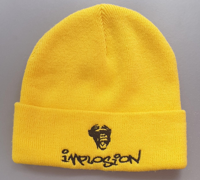 Yellow beanie hat with high quality embroidered logo in black. Cuffed design with double layer knit. Price includes delivery.